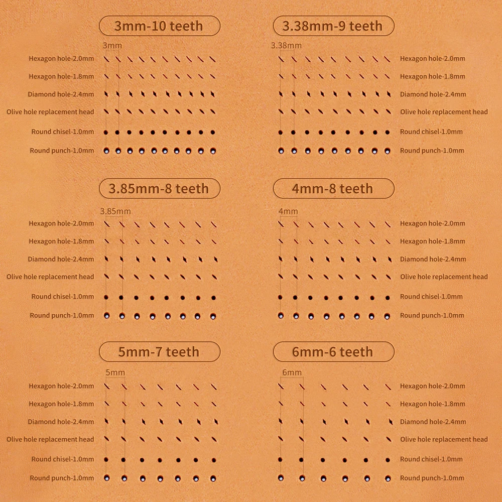 Dank der Zapfen- und Schlitzverbindung (Mortise-and-Tenon-Design) lässt sich ein Griff mit verschiedenen Adaptern und Schlagköpfen kombinieren. Je nach Auswahl sind Zahnabstände von 3 / 3,38 / 3,85 / 4 / 5 / 6 mm realisierbar. In Verbindung mit unterschiedlichen Lochformen ergeben sich bis zu 36 mögliche Varianten.